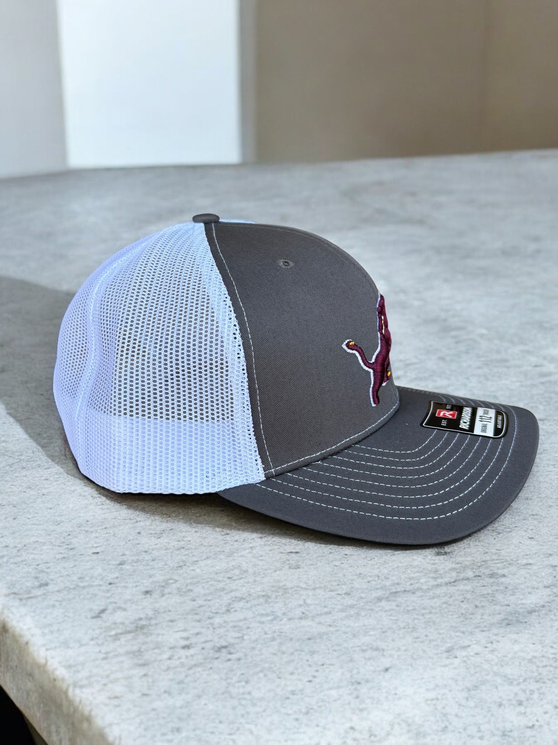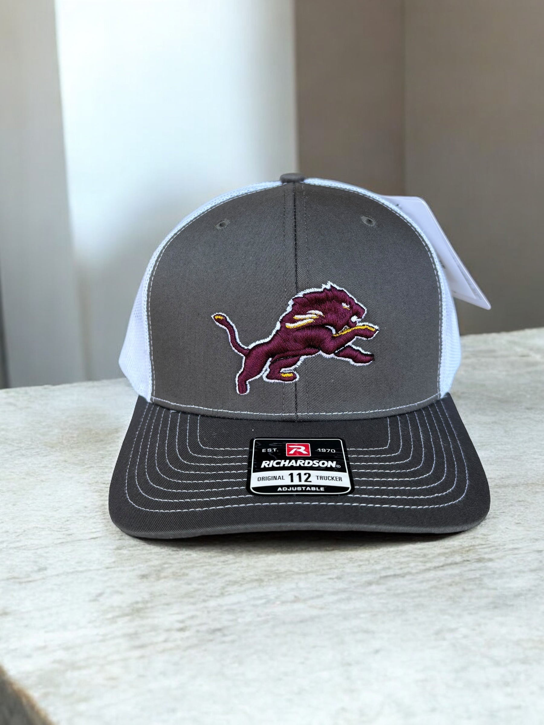 Richardson 112 charcoal front and white mesh hat is perfectly paired with a 3D embroidered lion! Perfect for game day or just to represent.