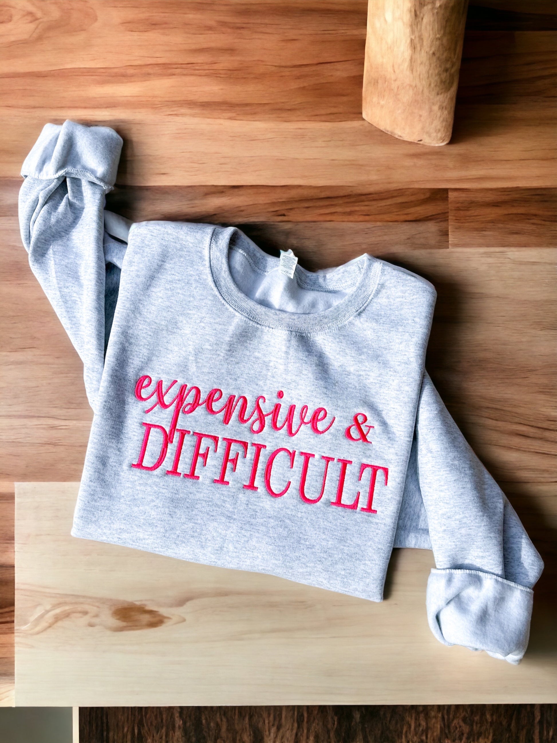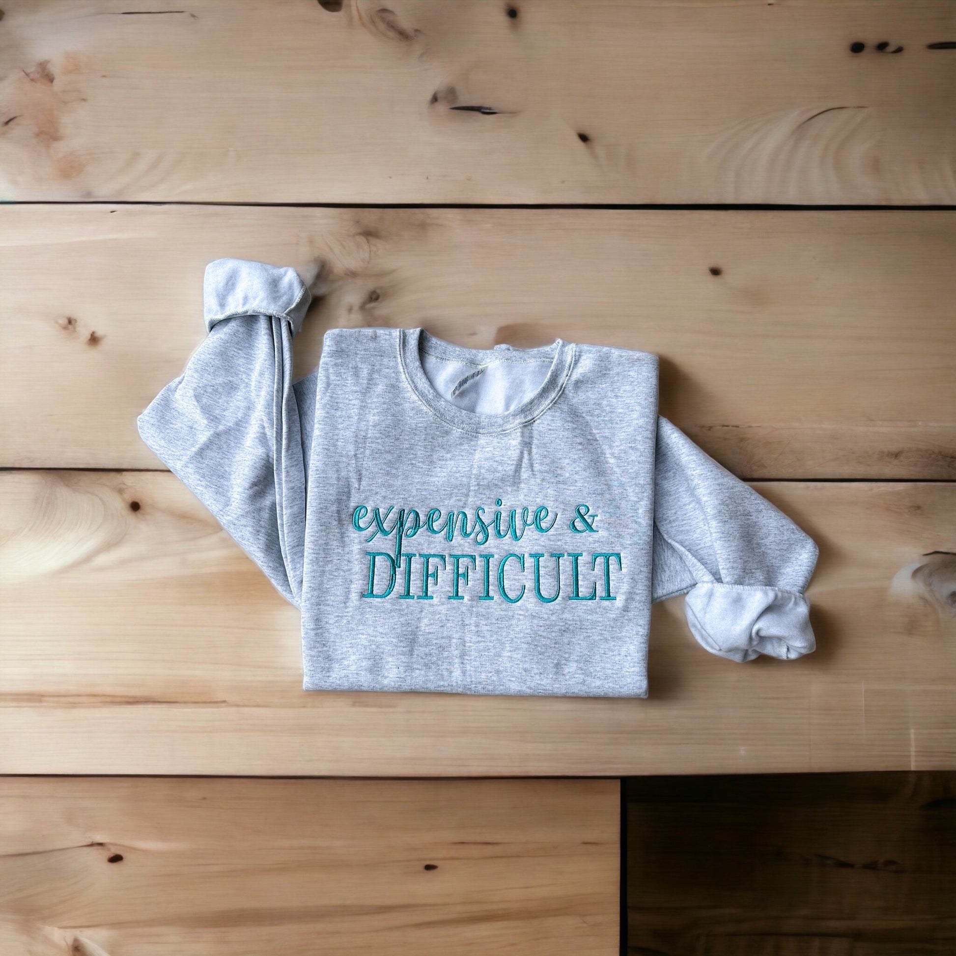 Embroidered "Expensive & Difficult" on a super soft light grey sweatshirt. Unisex sizing for a comfortable fit. Size up for an oversized look.