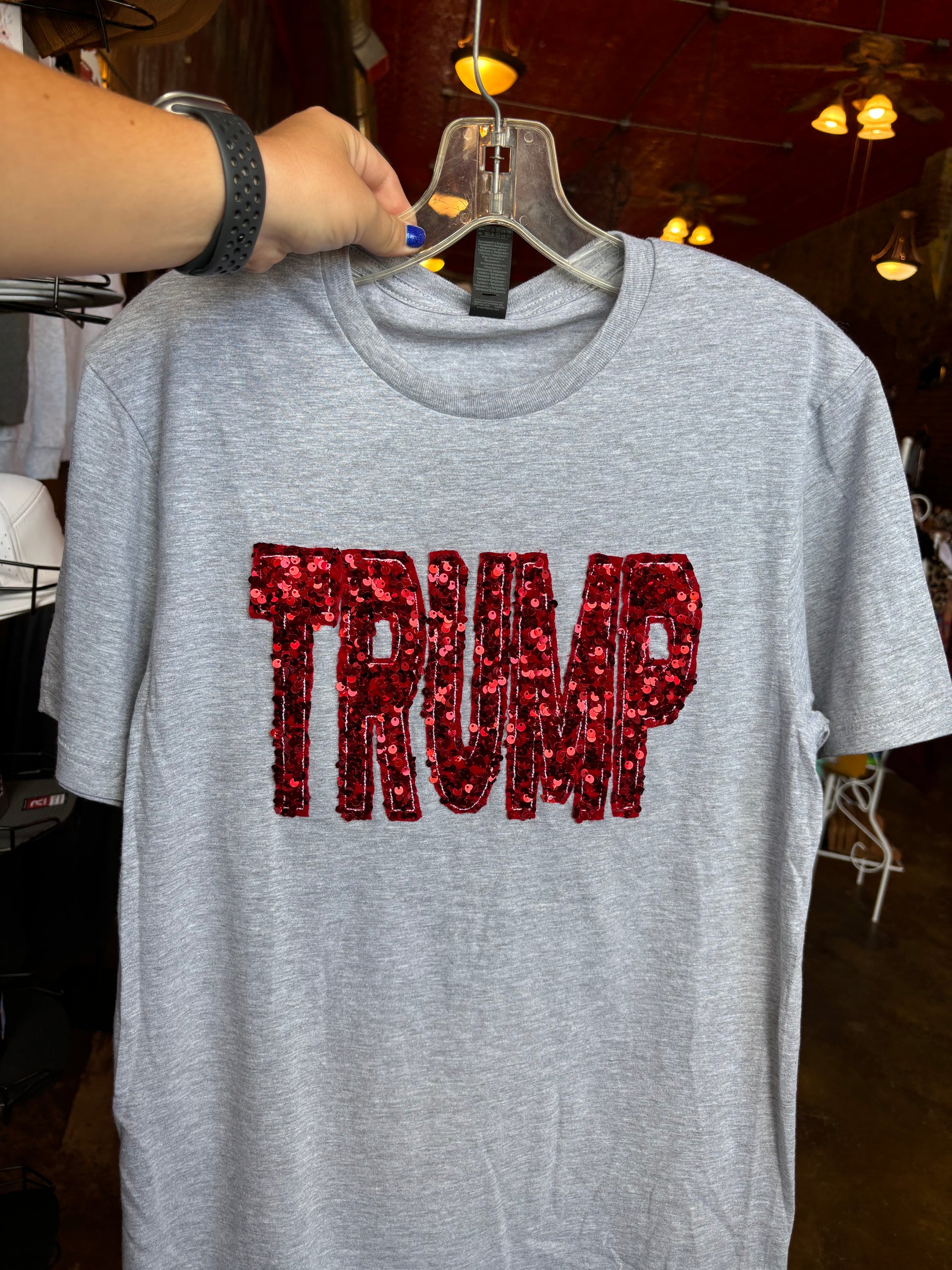 Sparkle, shine, and show off your support with one of our best sellers. This soft grey tee features red sequin letters spelling "Trump". It's the perfect way to make a statement and add some sparkle to your wardrobe.